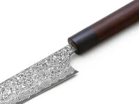 -Wert, Messgröße für die Härte des Stahls, liegt bei 61. VG-10 ist ein Edelstahl und enthält im Unterschied zu den Kohlenstoffstählen Aogami oder Shirogami ca. 15% Chrom. Die Ummantelung besteht aus Nickel Damast in 30 Lagen. Das Paket wird von Meister Yoshimi Kato von Hand kaltgeschmiedet. Finish: Optisch wird die Klinge natürlich durch die Damast Lagen dominiert. Um einen zusätzlichen Schutz mit rosthemmender Wirkung zu erzielen, sind die Kurosome Messer brüniert, was die edle Optik unterstreicht. Griff: Der Griff dieser Messer ist aus hochwertigem