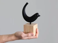Die dekorative Figur Tori steht stolz auf einem Holzsockel und strahlt pfiffigen Optimismus aus.