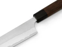 Material: Der blaue Papierstahl ist und bleibt der beliebteste Messerstahl in Japan. Er ist verschleißfester als Shirogami, damit noch schnitthaltiger, bietet eine extrem hohe Härte und ein begeisterndes Schärfepotential. Aogami super ist der Stahl unter den blauen Papierstählen mit den besten Eigenschaften und kann mit etwas Übung so scharf geschliffen werden, wie kaum ein anderer Stahl – rasiermesserscharf. Unsere Messerserie Nashiji von Yoshimi Kato ist mit Aogami super und einer Außenhaut (Ummantelung), fein säuberlich vom Meister Yoshimi Kato, Sohn von Hiroshi Kato, selbst „feuerpoliert“ geschmiedet. Der Stahl der Ummantelung und das Finish Nashiji sehen nicht nur sehr gut aus, sie schützen auch vor Rost, ohne nach europäischem Maßstab rostfrei zu sein. Bei einer üblichen und sorgfältigen Behandlung ist ein Rostbefall nahezu ausgeschlossen. Die ungetrübte Freude an diesem Messer kann ein Leben lang dauern. Finish: Nashiji, oder auch Pear Skin Finish, ist eine japanische Spezialität. Funktional bietet es einen zusätzlichen Schutz der feinen Klinge und erleichtert die Schneidarbeit durch verringertes Haften des Schnittgutes. Hauchdünne Filets vom Fisch oder Fleisch, feine Scheiben von Gurken, Tomaten oder Zwiebeln haben fast keine Chance an der Klinge zu haften. Optisch ist es für Liebhaber ein echter Leckerbissen, japanische Messer mit diesem Finish sind sehr gefragt. Die gepunktete Struktur und der feine Satin-Schimmer geben dem Messer einen ganz eigenen Charme und Charakter. Griff: Die Messer Griffe der Nashiji Serie sind 8-eckig ausgeführt, sehr griffig und rutschfest. Das